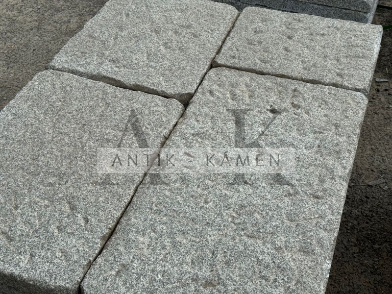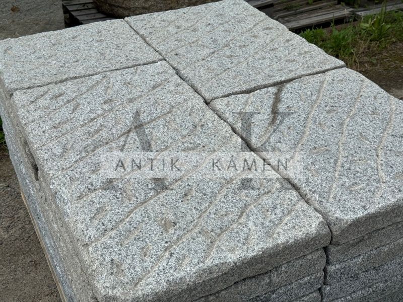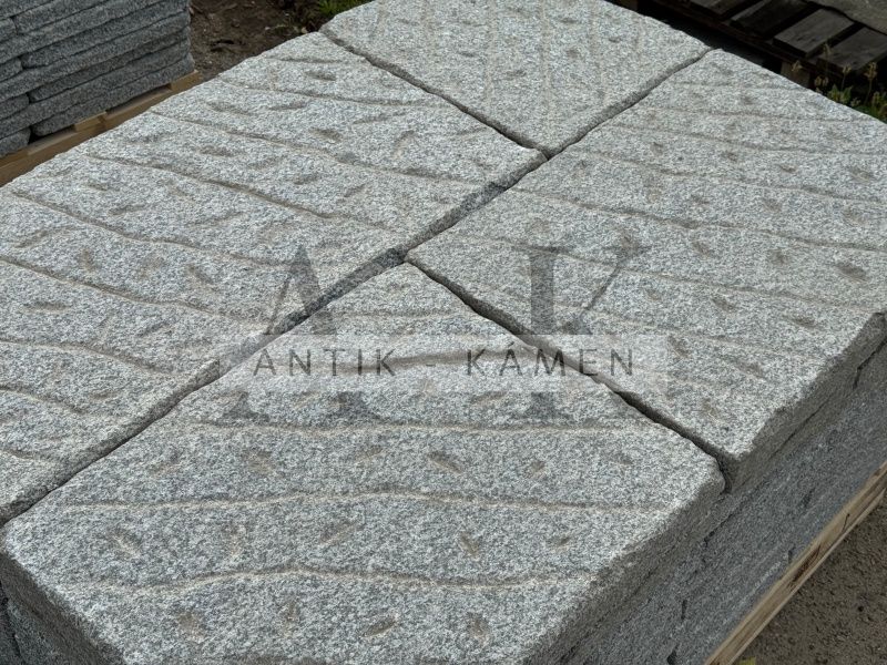 Rustikální historizující kamenná dlažba s pemrlovaným povrchem a lámanými hranami.