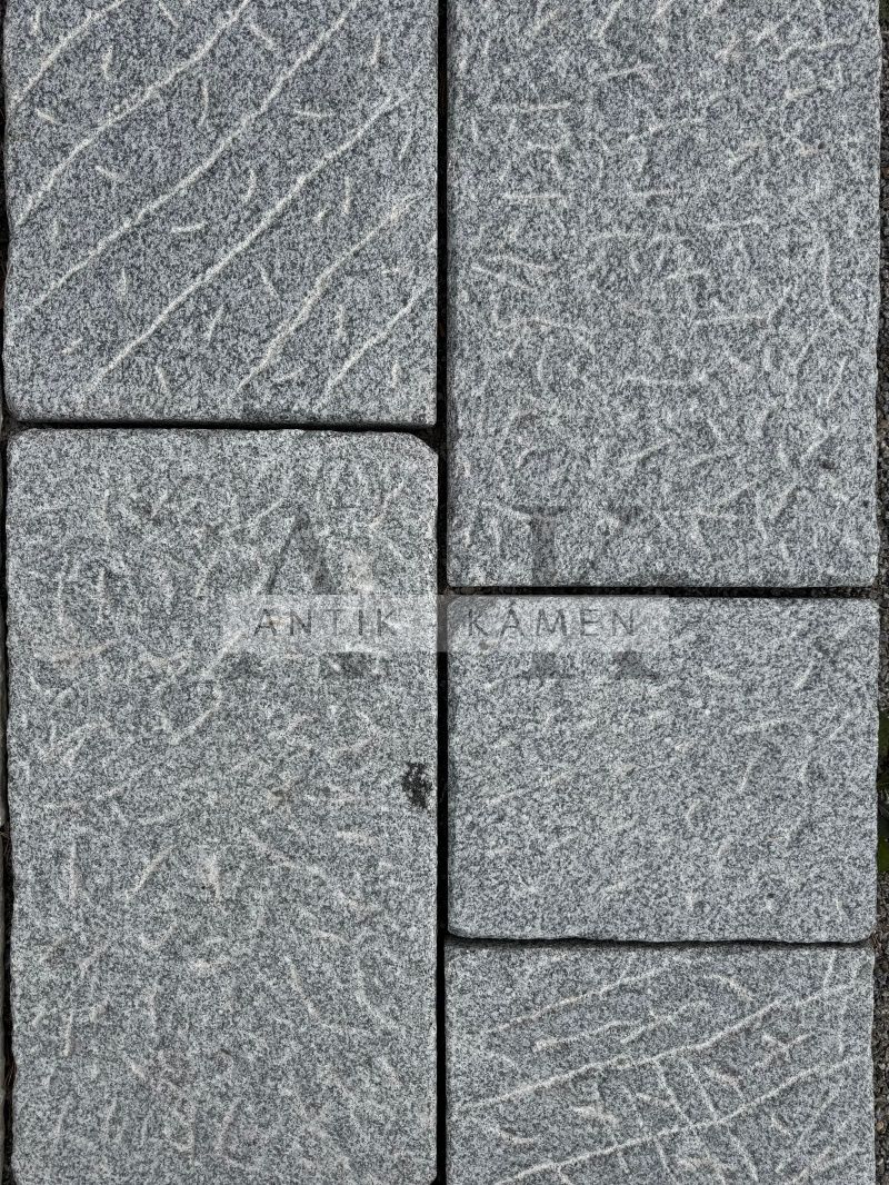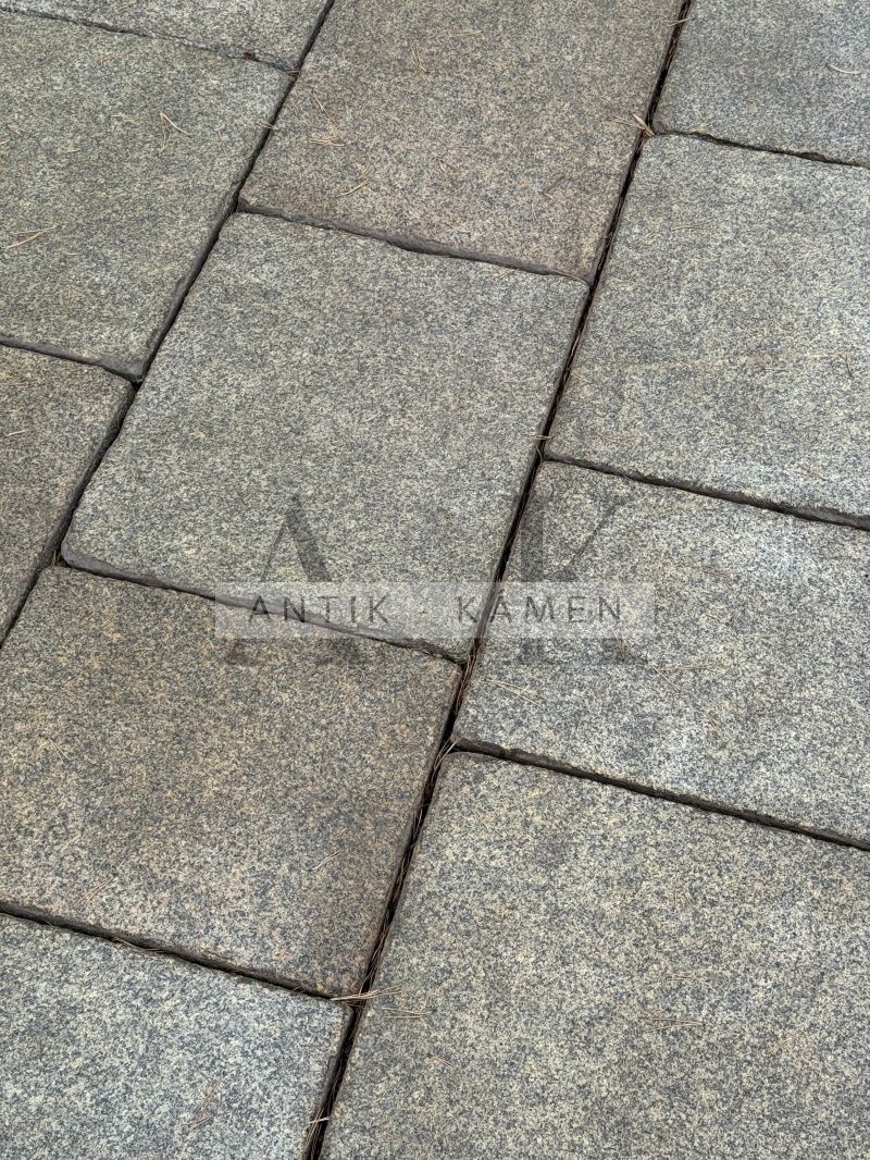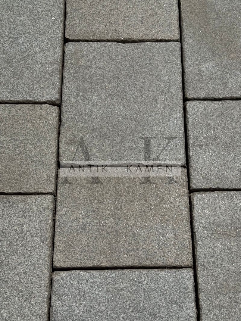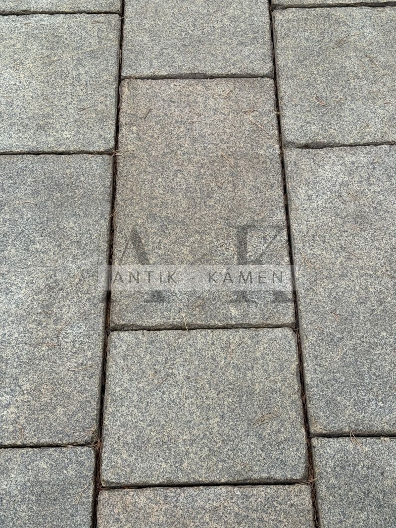 Šedá žulová dlažba s opáleným povrchem a řezanými hranami. Dlažba je k dispozici v následujících rozměrech: