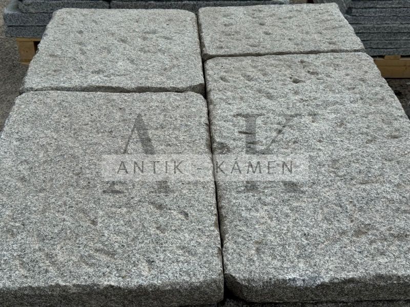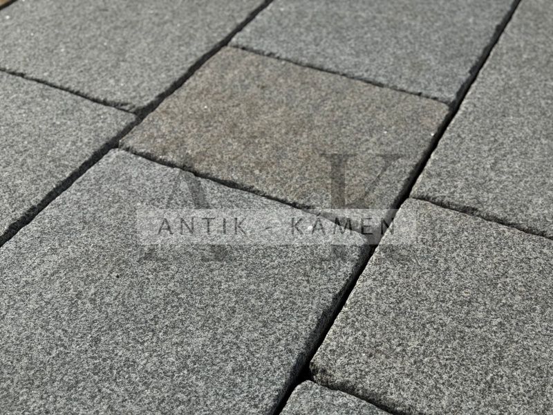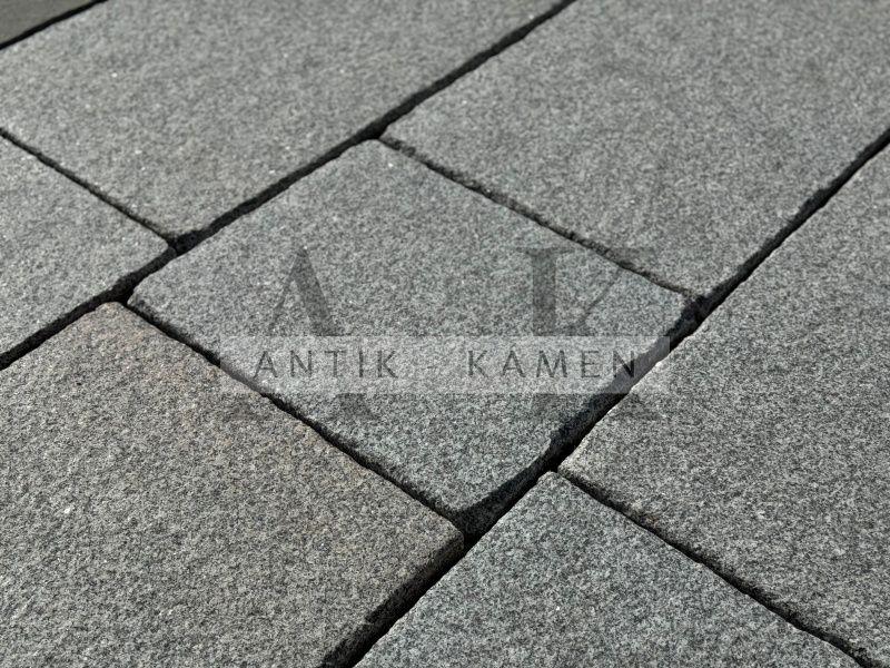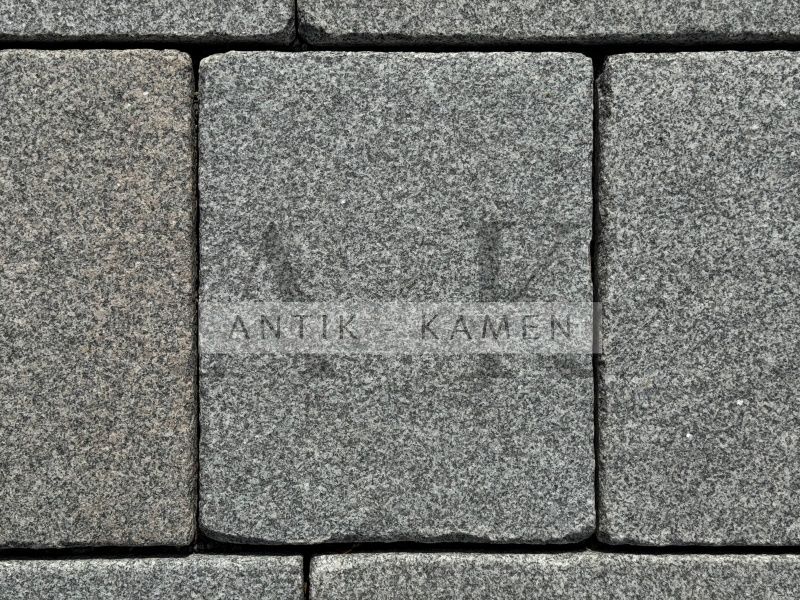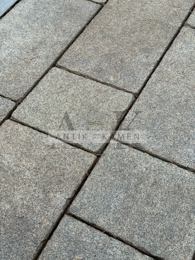 Šedá žulová dlažba s opáleným povrchem a řezanými hranami. Dlažba je k dispozici v následujících rozměrech:
